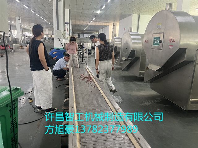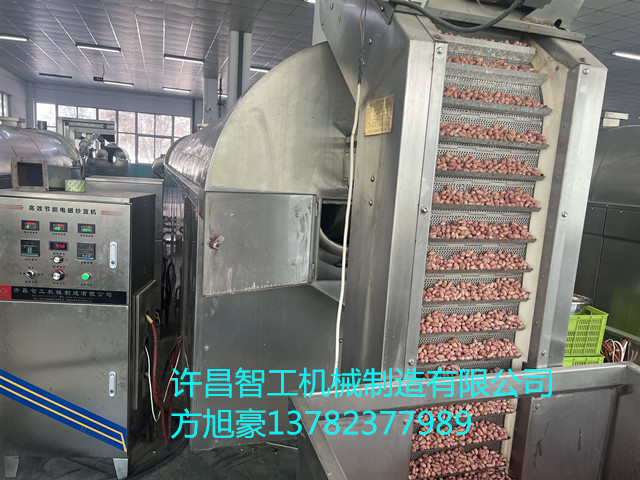 許昌智工八米電磁流水線包含上料炒制篩選冷卻流水線操作,時(shí)產(chǎn)五香花生米1200斤,炒出來的花生米色澤漂亮,不脫皮,不變色,口感均勻。